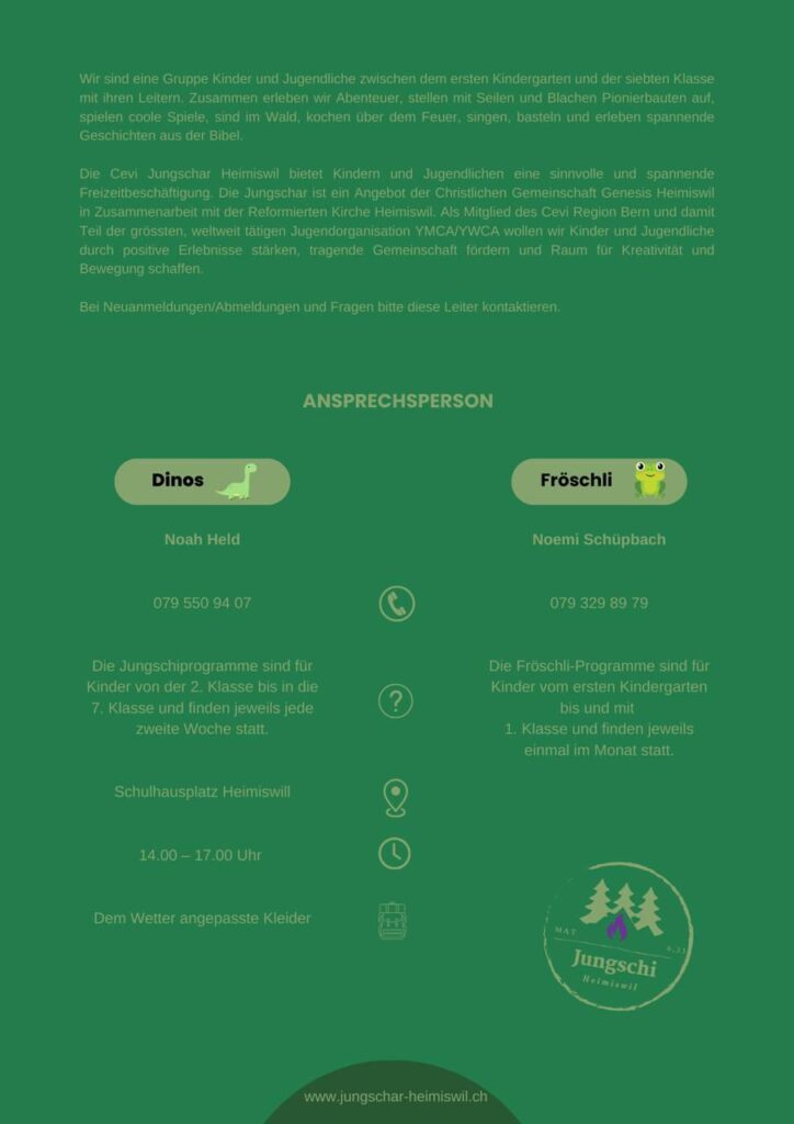 Die Jungschar ist ein Angebot der christlichen Gemeinschaft Genesis Heimiswil in enger Zusammenarbeit mit der Kirchgemeinde Heimiswil.